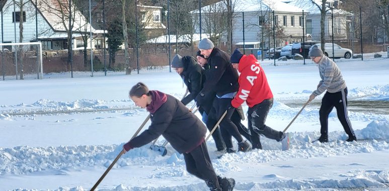 Der Vorstand hatte für Sonnabend ab 11 Uhr zum Schnee schieben aufgerufen und etwa 35 Fans, Männer- und Nachwuchsspieler sowie weitere Vereinsmitglieder hatten sich, bei durchaus eisigen Temperaturen, auf dem Sportgelände eingefunden, um den Schneemassen zu Leibe zu rücken.